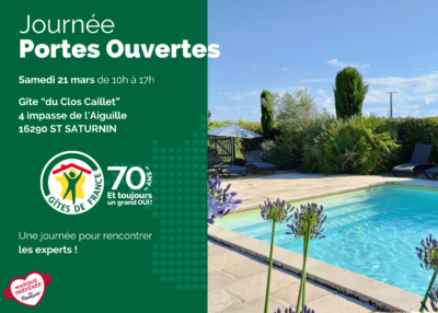 Samedi 21 mars, de 10h à 17h, Gîtes de France Charente ouvre ses portes. Profitez de la journée pour rencontrer ses experts, au gîte du Clos Caillet à Saint Saturnin.